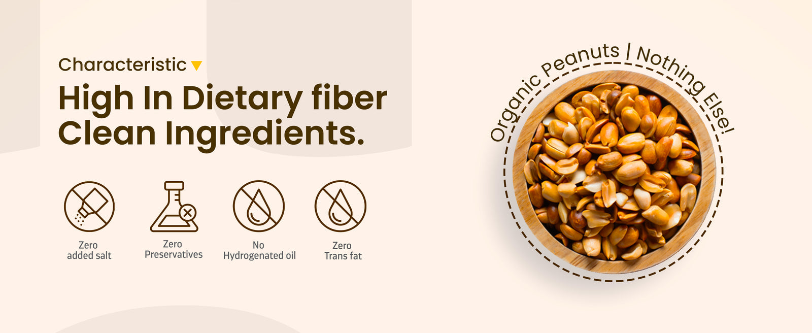 Tags Butter, Creamy, Dietary Fiber, High Protein 30g & 9g, No Added Sugar, No Preservatives, Organic Peanuts
